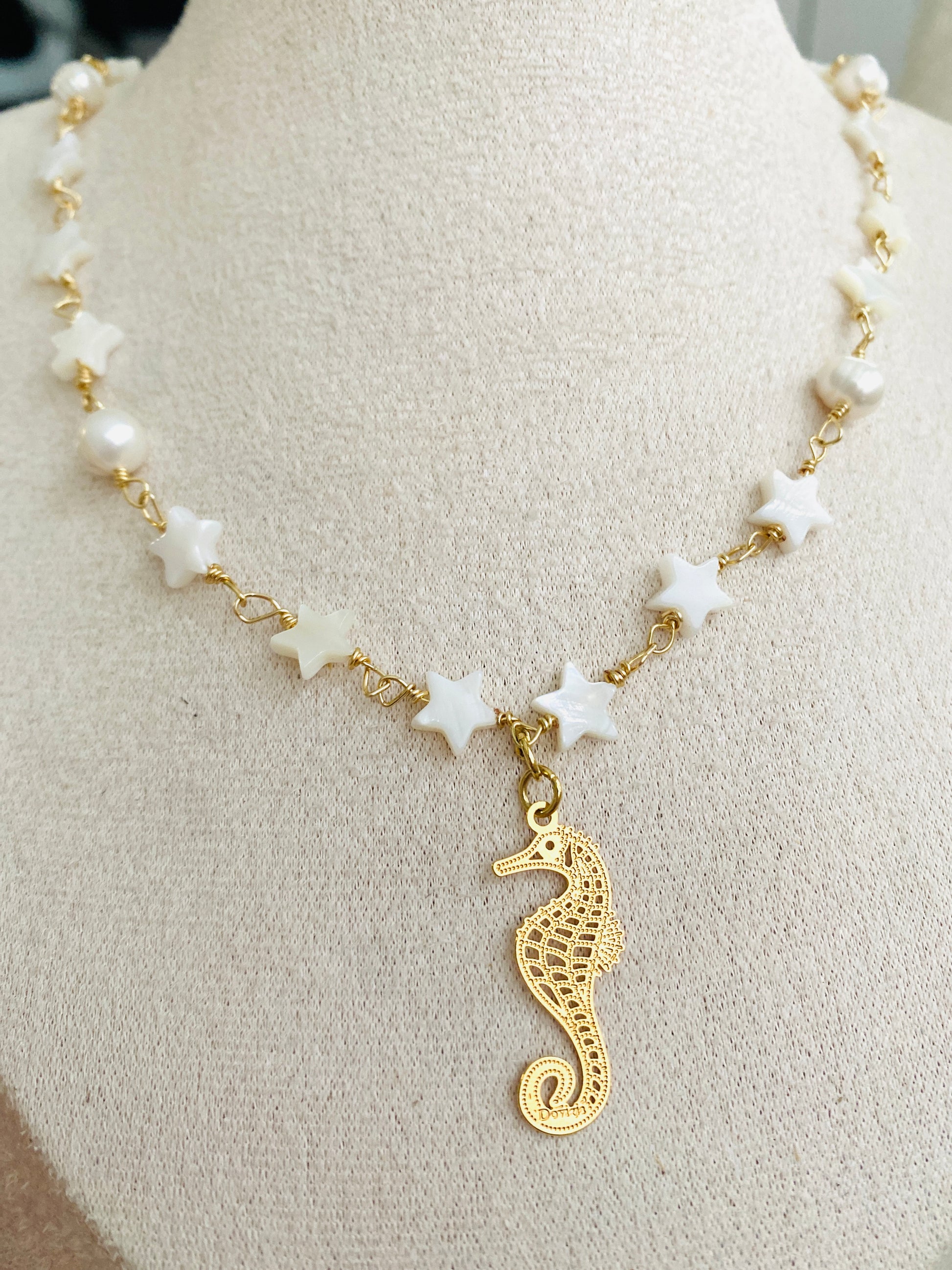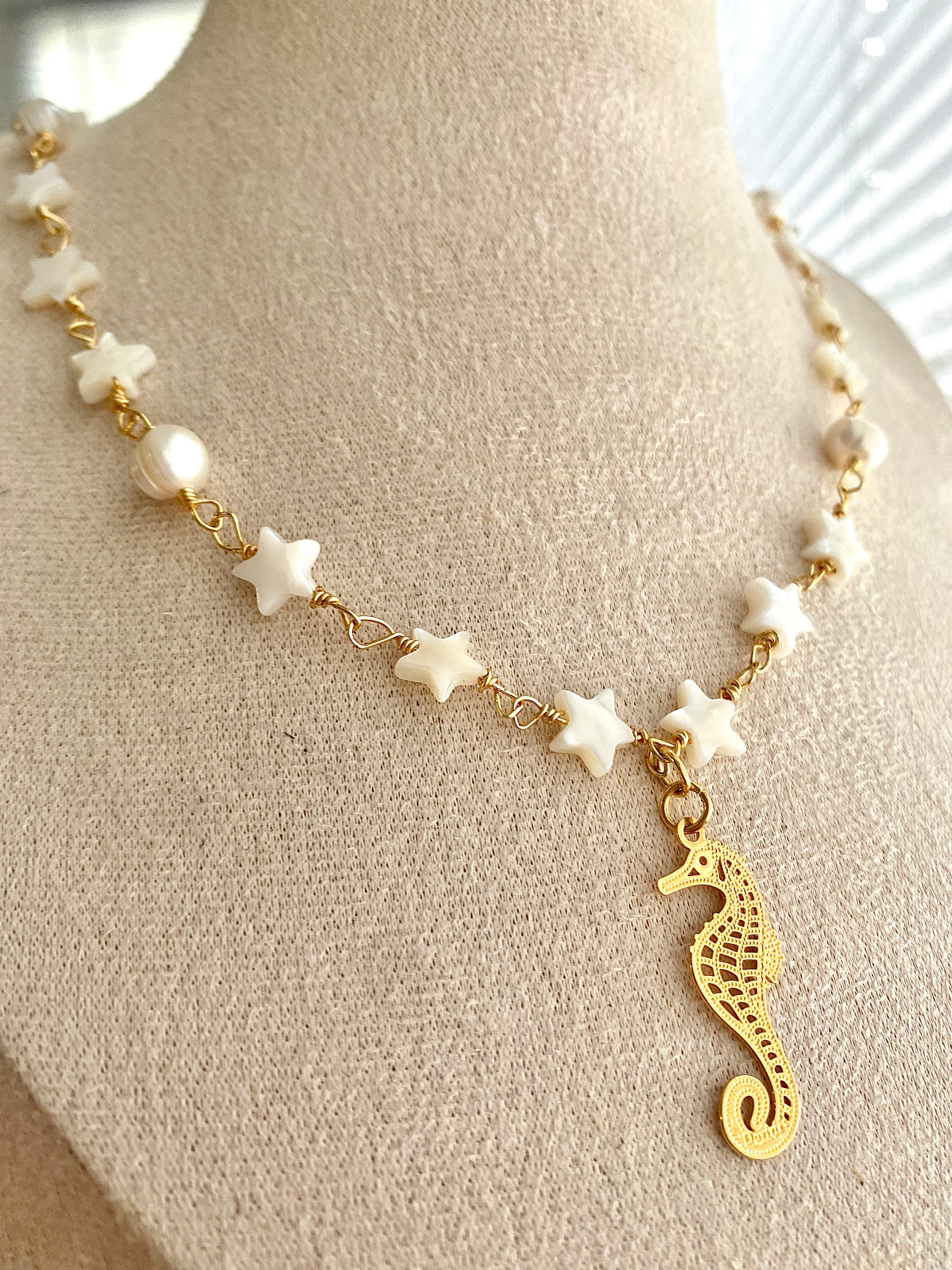 The Sea Necklace features a distinctive seashell design crafted with 18k gold-plated wire and adorned with a seahorse charm. This piece offers a touch of elegance, making it suitable for both casual and formal occasions. With its unique attributes, it serves as an exceptional addition to any jewelry collection.